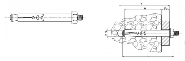 | Размер | D0 –диаметр отверстия для установки под анкер (мм) | T min –минимальная глубина установки | H min – минимальная глубина анкеровки | L – длина анкерного болта | Da – максимальная толщина материала в который монтируется анкер | Резьба | Fmin – минимальная сила на вырывание из бетона В25, (Кн) | Fi – максимально допустимый изгибающий момент, (Нм) | Fk – допустимый крутящей момент при монтажных работах, (Нм) | Вес 1000 шт | |