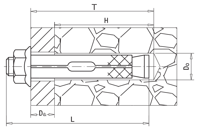 Анкер фиксируют в стене/потолке методом сквозного монтажа. Работа происходит следующим образом: анкерный болт с шестигранной головкой вставляют в отверстие прикрепляемой конструкции. Предварительно в базовом материале просверливают дыру по размеру анкера. Далее болт с шестигранной головкой и с гильзой вводят в отверстие, фиксируя его окончательно – закручивая, как гайку. Монтаж надежен, поскольку распорная цанга после установки в отверстие расклинивает внешнюю оболочку, поэтому анкер устойчиво удерживается в бетоне (камне, кирпиче).