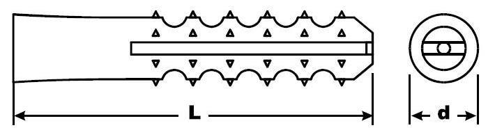 Предназначен для незначительных нагрузок 3-5 кг (например, крепление карнизов занавесок, полотенцедержателей, настенных украшений и др). Устанавливается в полнотелые материалы. Диаметр – 5, 6, 8, 10, 12 мм. Полипропиленовый дюбель уступает нейлоновым по долговечности и нагрузочным характеристикам. Предназначен для фиксации различных саморезов и шурупов, в том числе и "глухарей" din 571 малых диаметров.